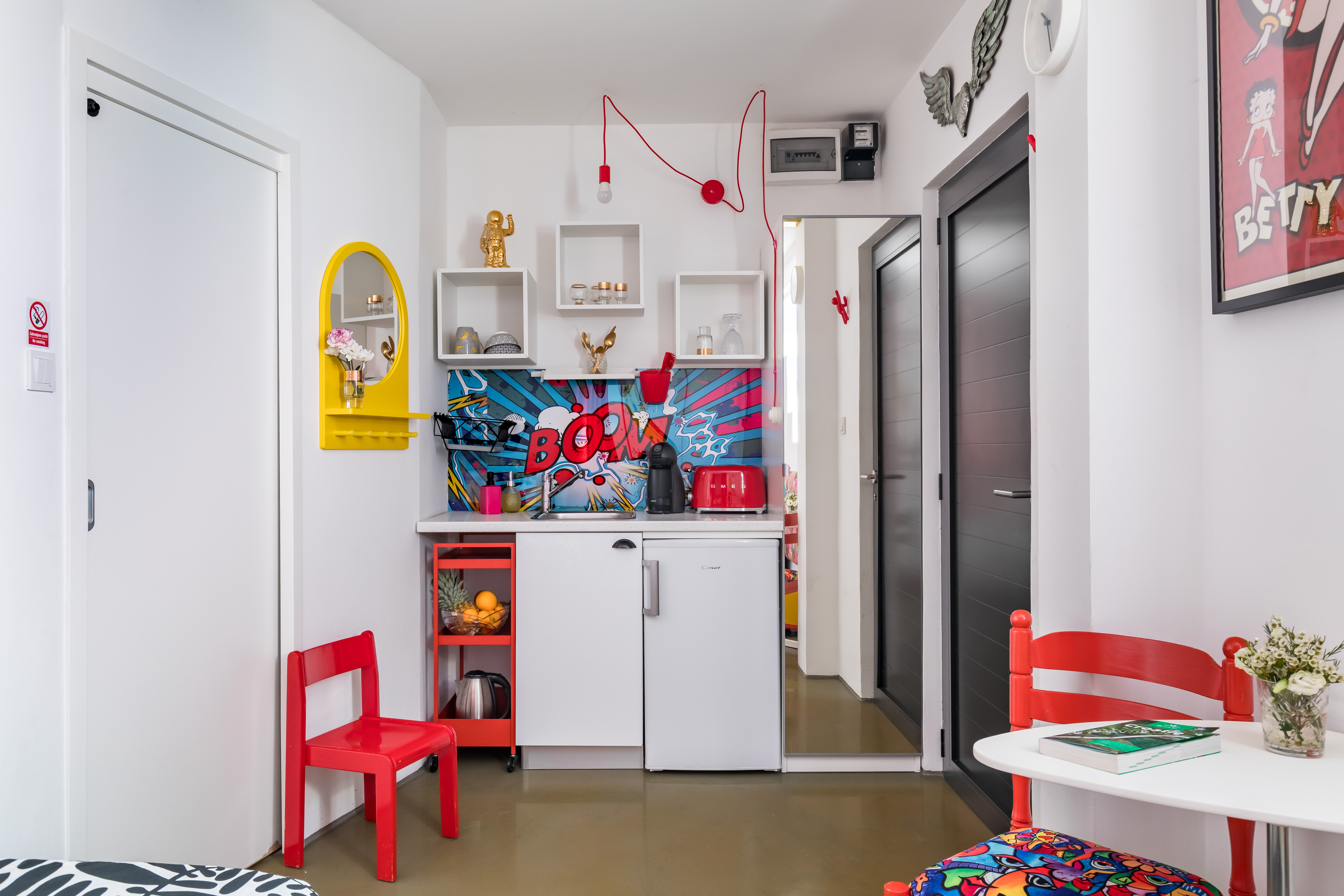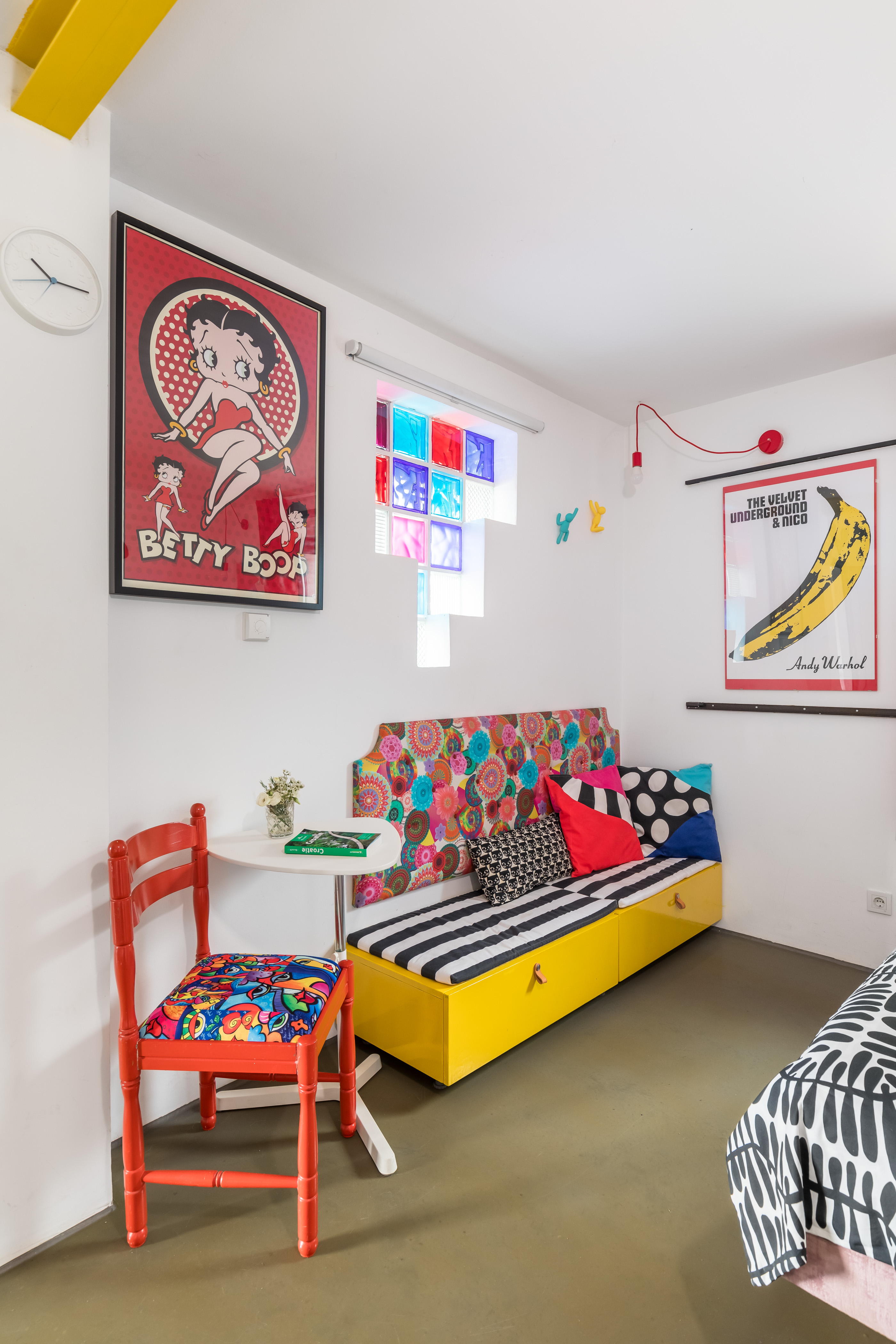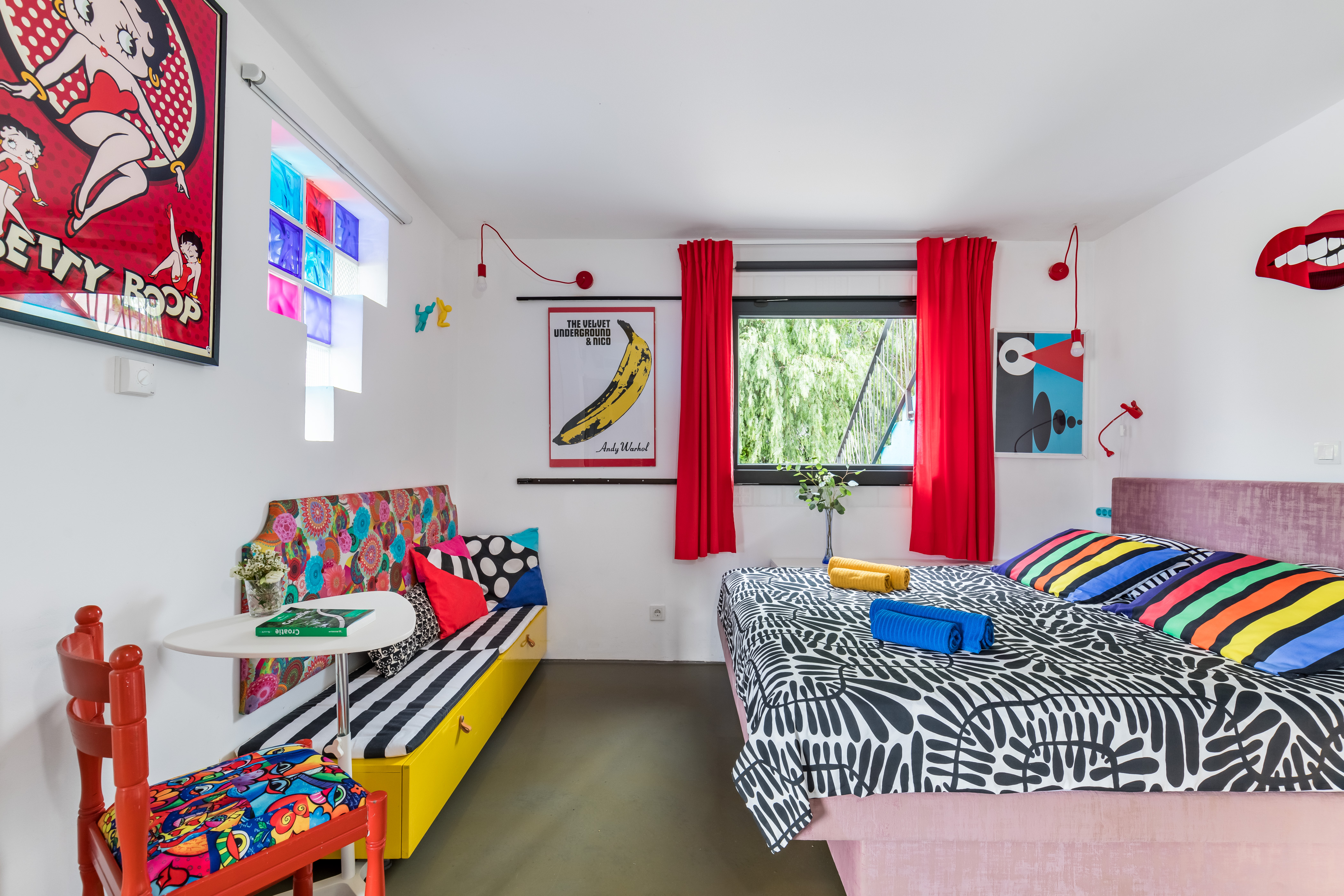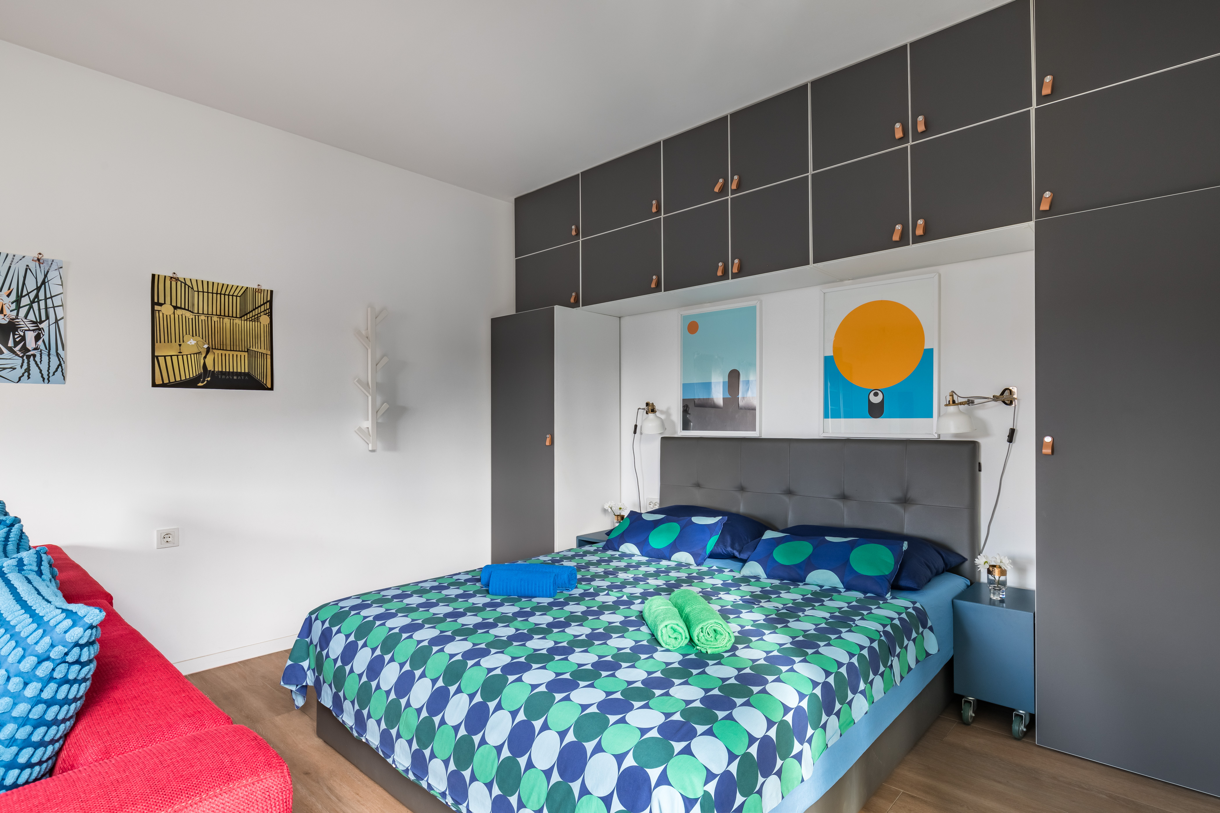 APARTMENT “S” or “Pop-Art” is decorated in a modern style with bright, colourful details, Lichtenstein’s posters, fresh white furniture, and poured epoxy floors. Although it’s the smallest, it has everything you need: a kitchenette, a stylish bathroom, and the only king-size bed, making it ideal for solo travellers, couples, and new families.