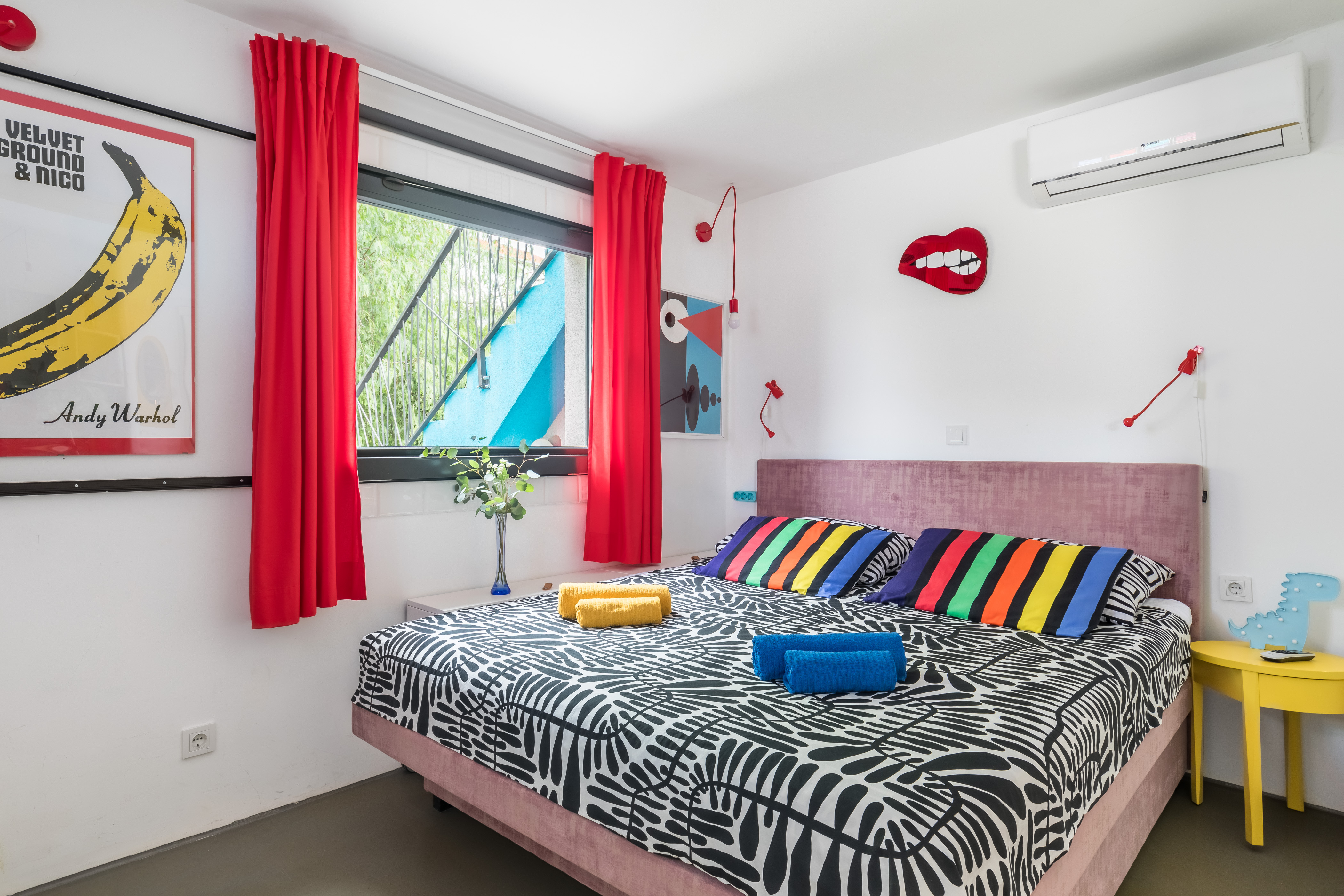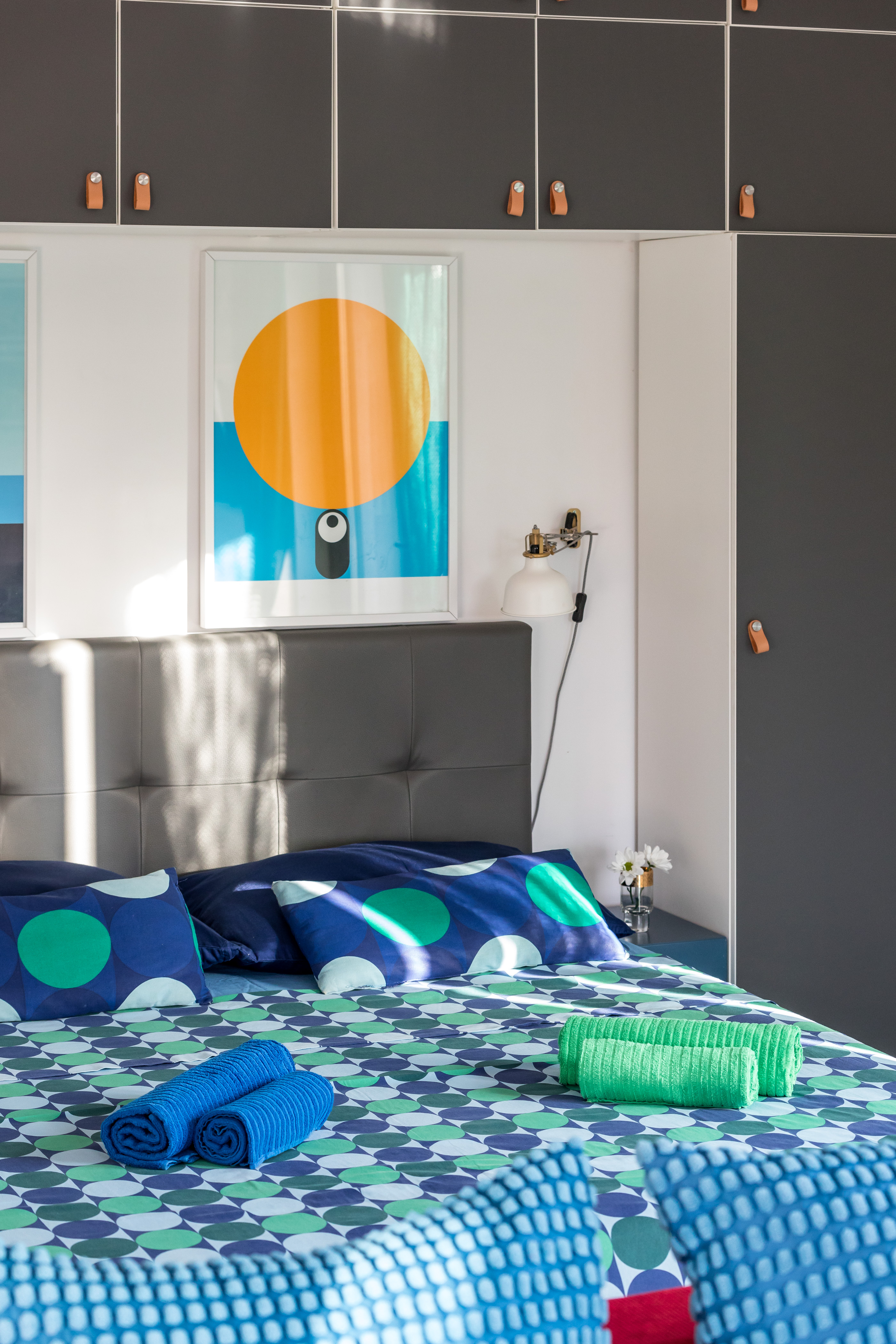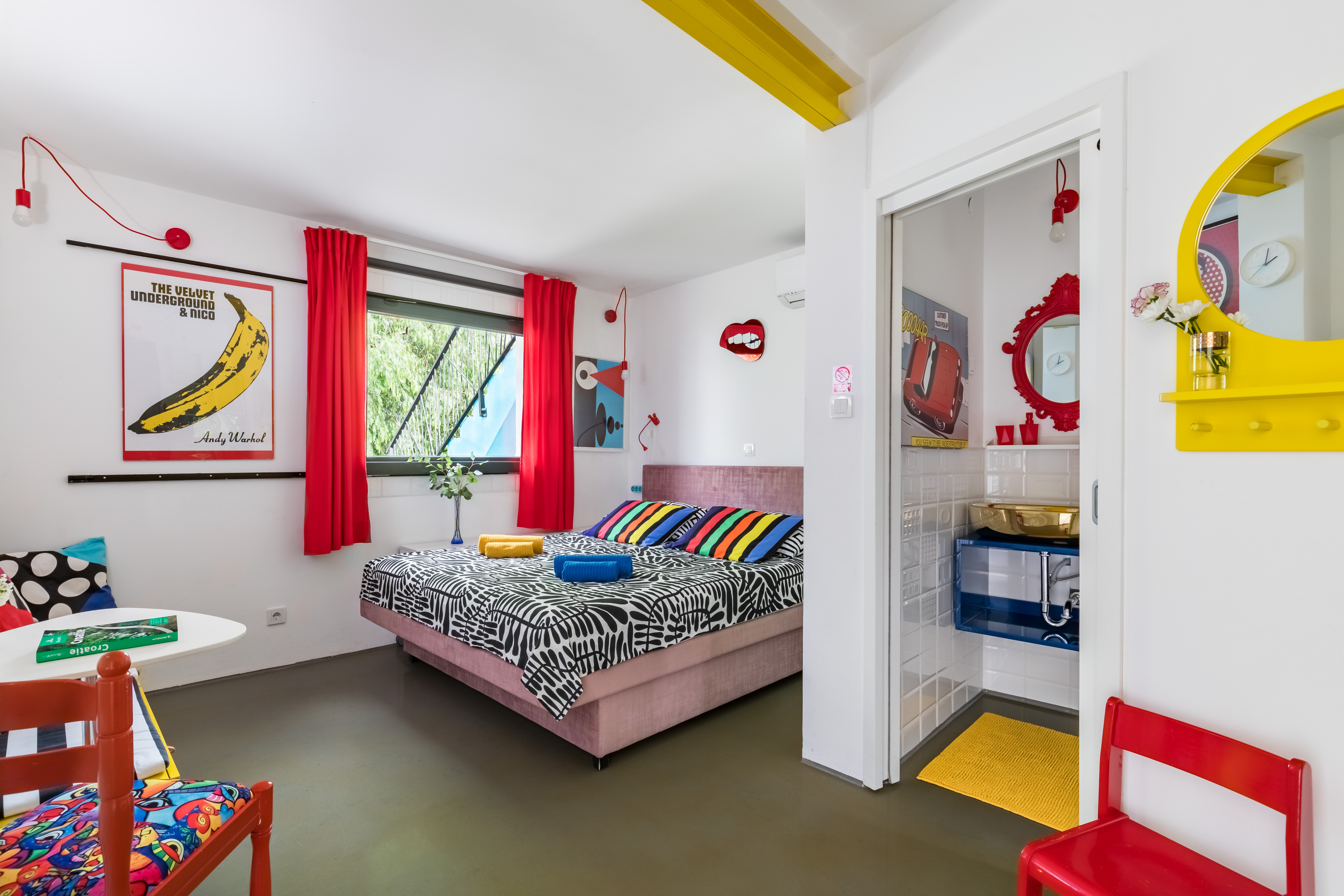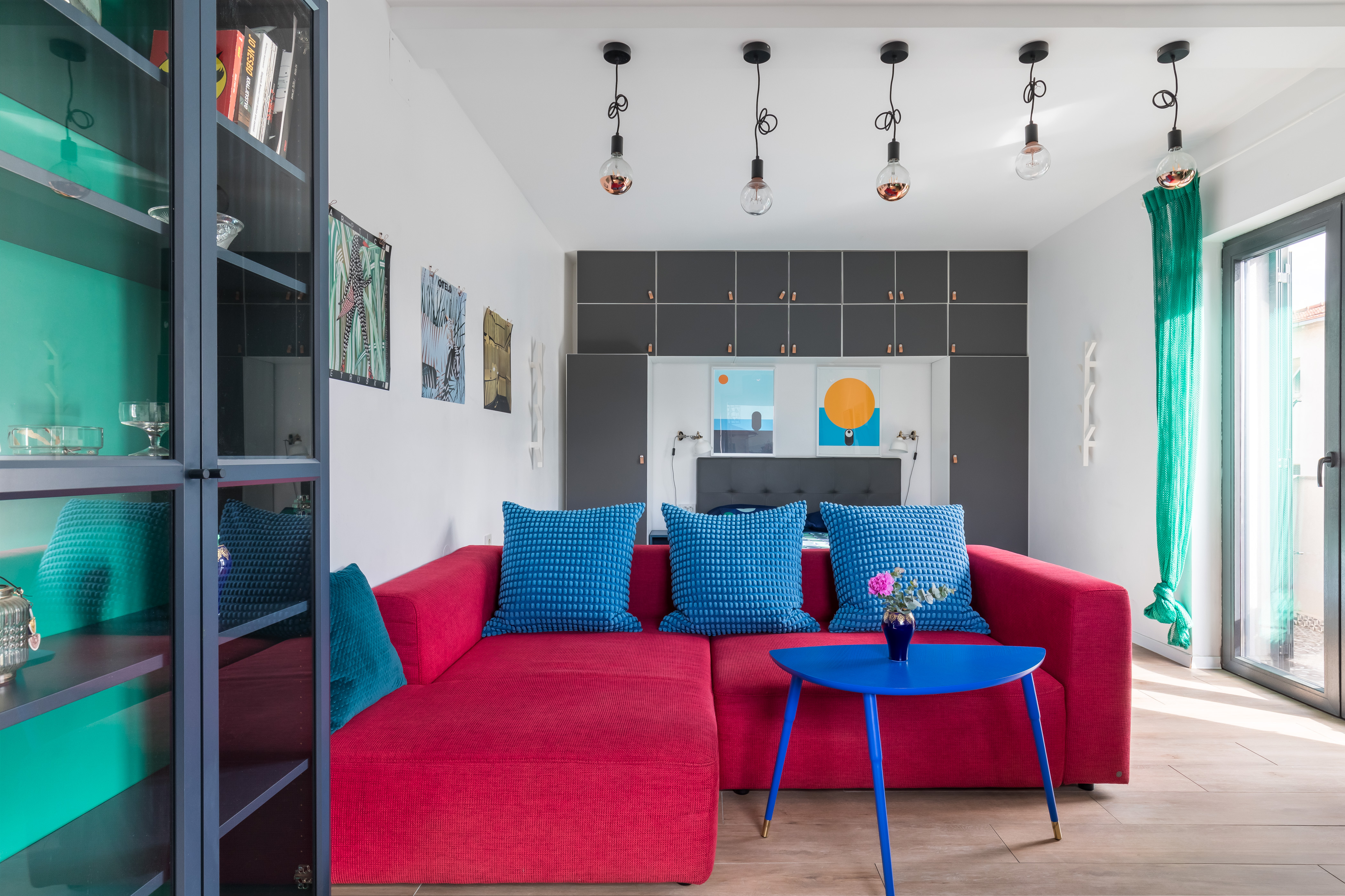 APARTMENT “S” or “Pop-Art” is decorated in a modern style with bright, colourful details, Lichtenstein’s posters, fresh white furniture, and poured epoxy floors. Although it’s the smallest, it has everything you need: a kitchenette, a stylish bathroom, and the only king-size bed, making it ideal for solo travellers, couples, and new families.