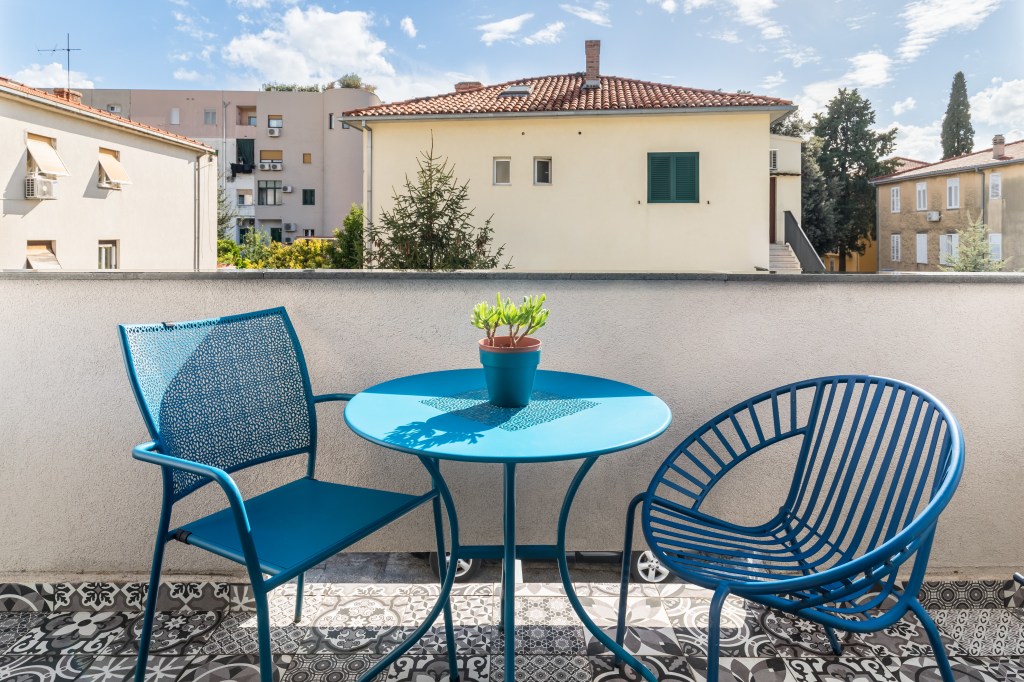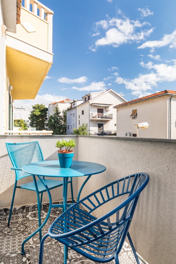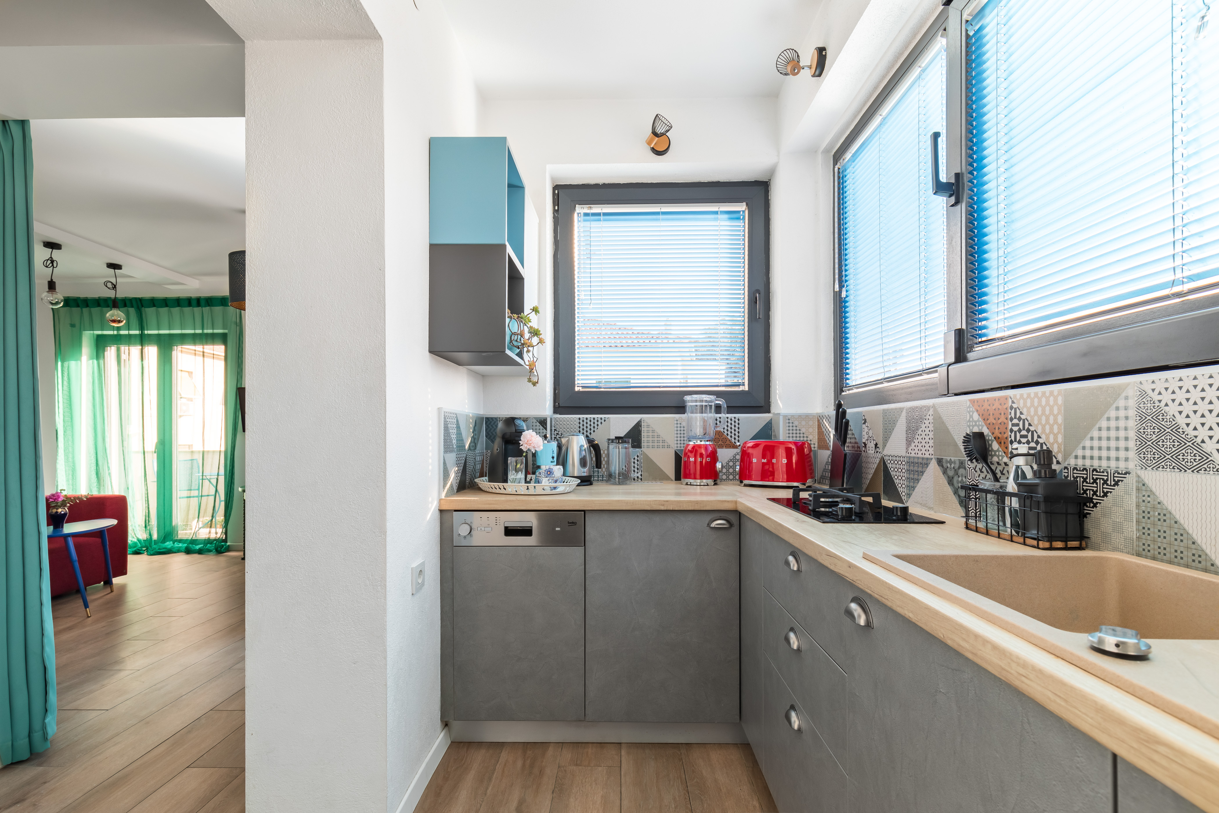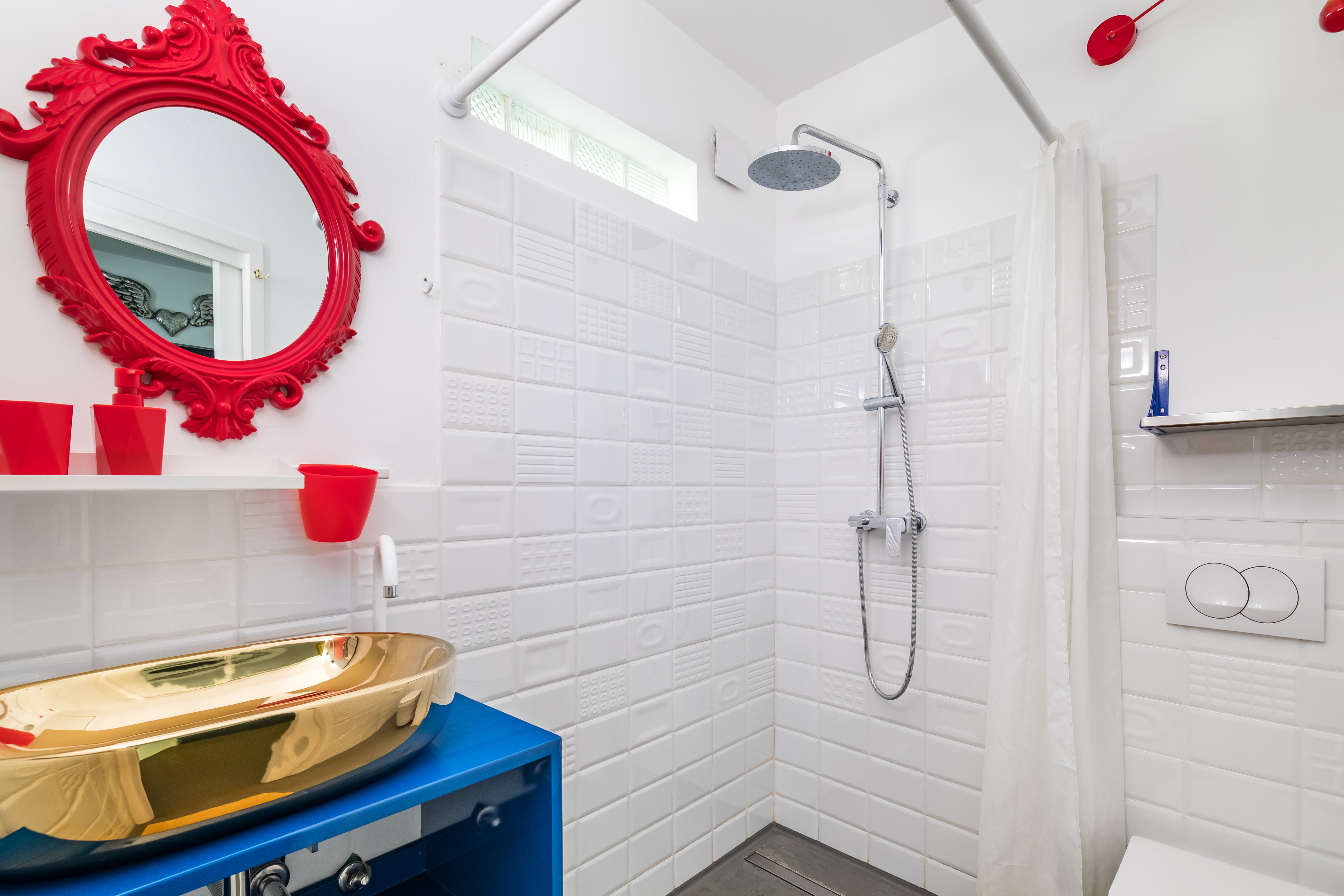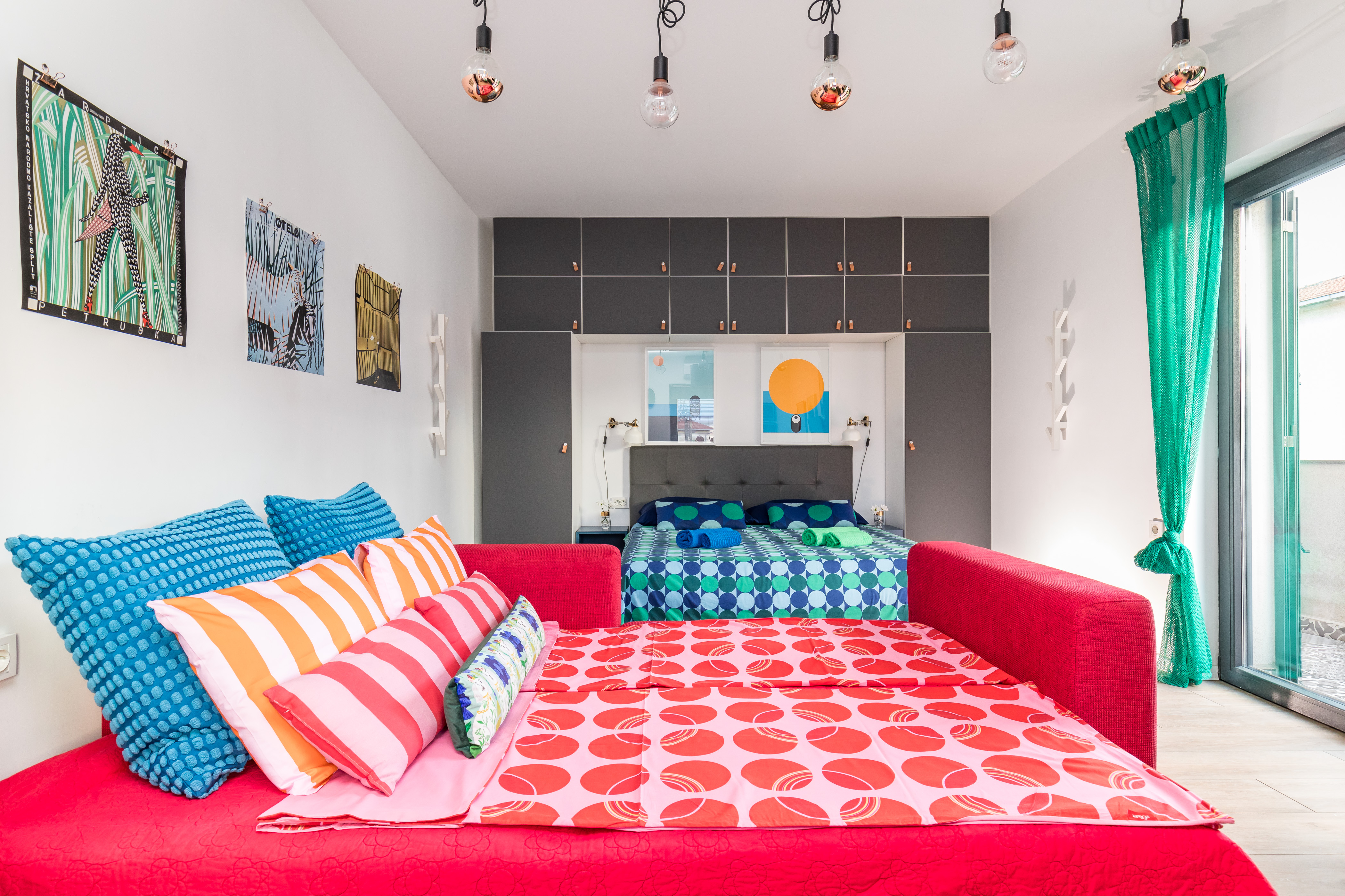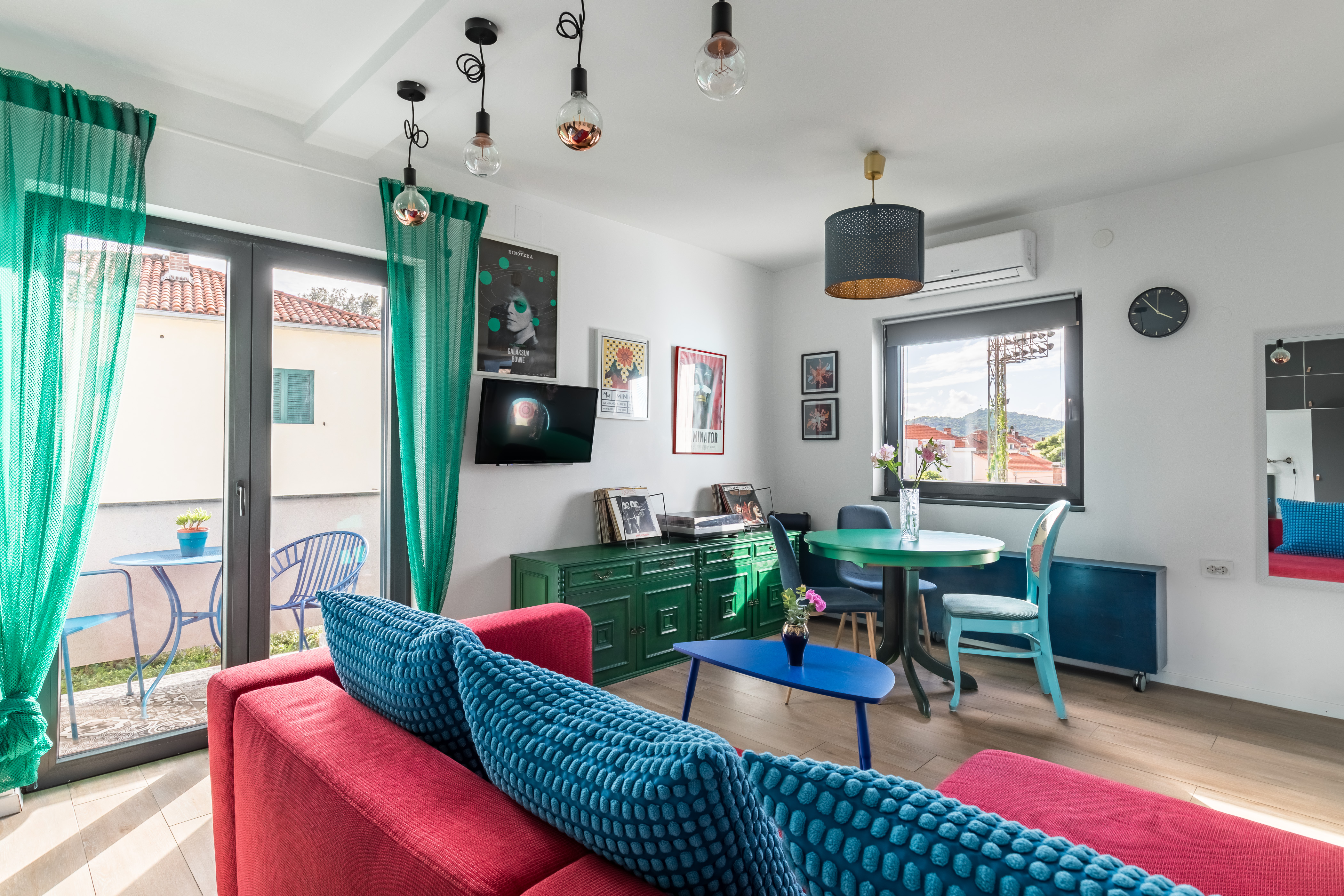 APARTMENT “L” or “Graphic Art” is warm and classy. It’s filled with sunlight, large windows, and has a private balcony. This apartment boasts a kitchen with stove and dishwasher. The open-plan living area features a queen-size bed and a large extendable sofa, accommodating up to four guests. A kidney-shaped bathtub with a seat provides a relaxing soak. A television and retro turntable with a vinyl collection are added bonuses for your enjoyment, enhanced by posters of famous contemporary Croatian artist Boris Bućan and some young graphic designers from Split, whose posters are also available for purchase.