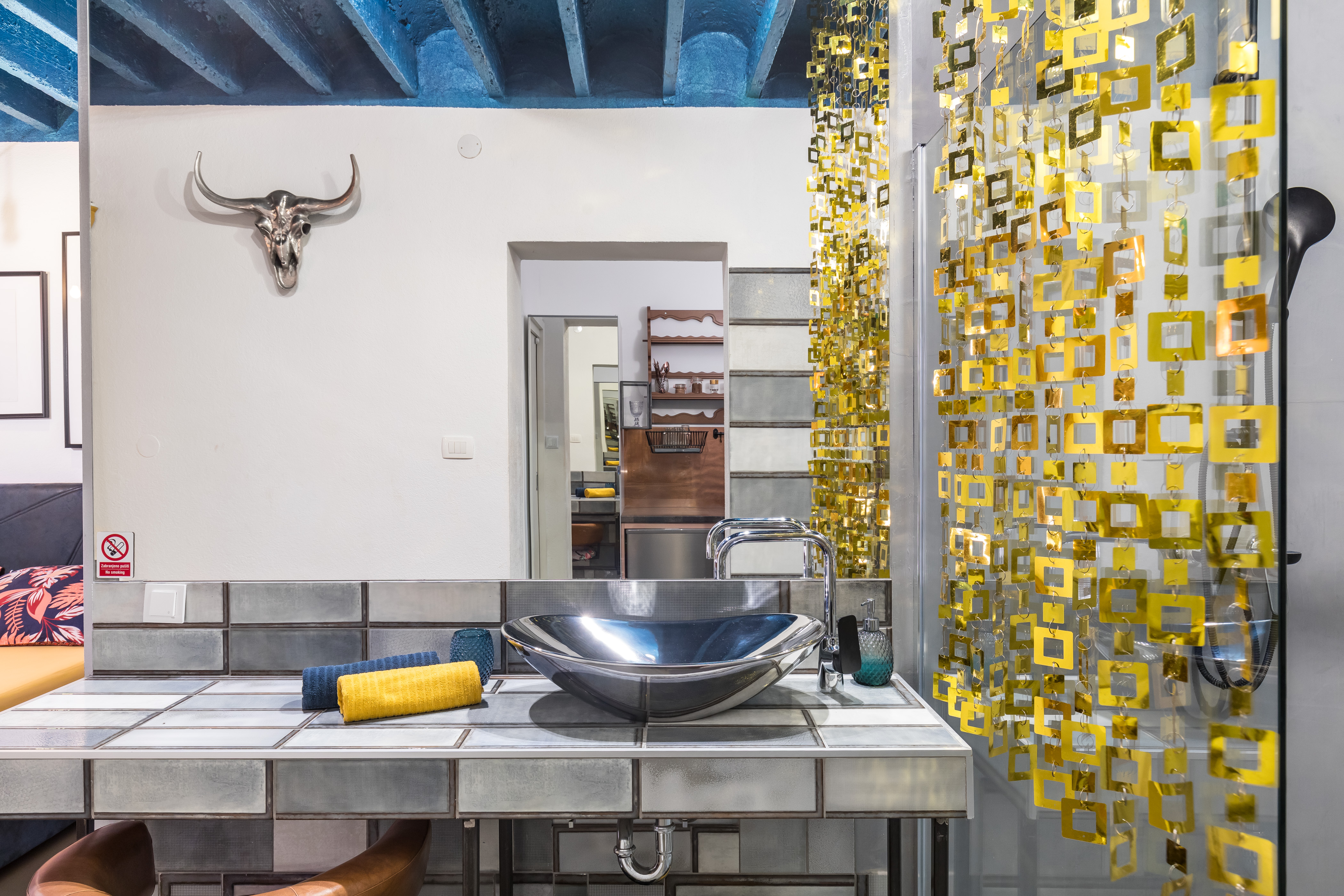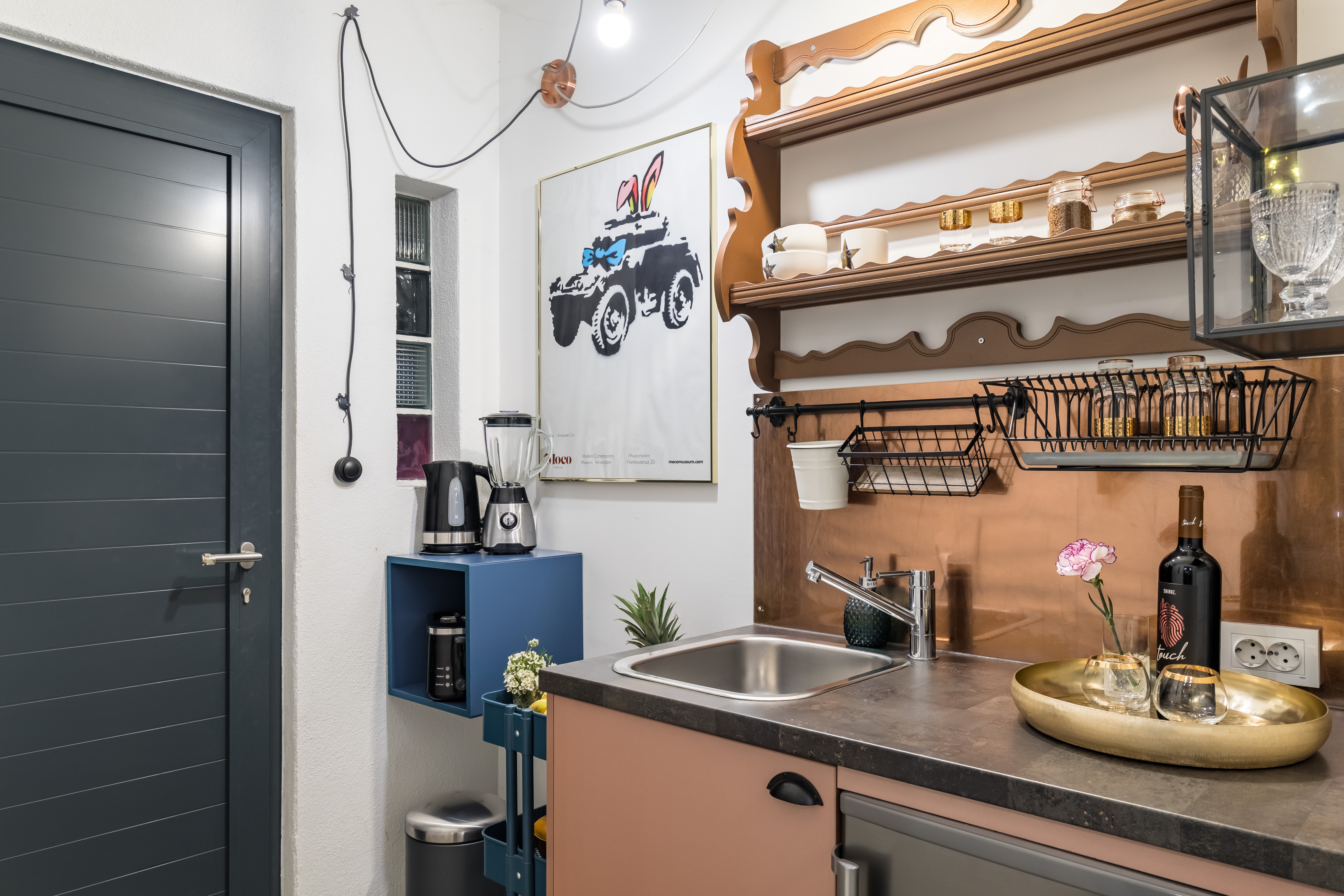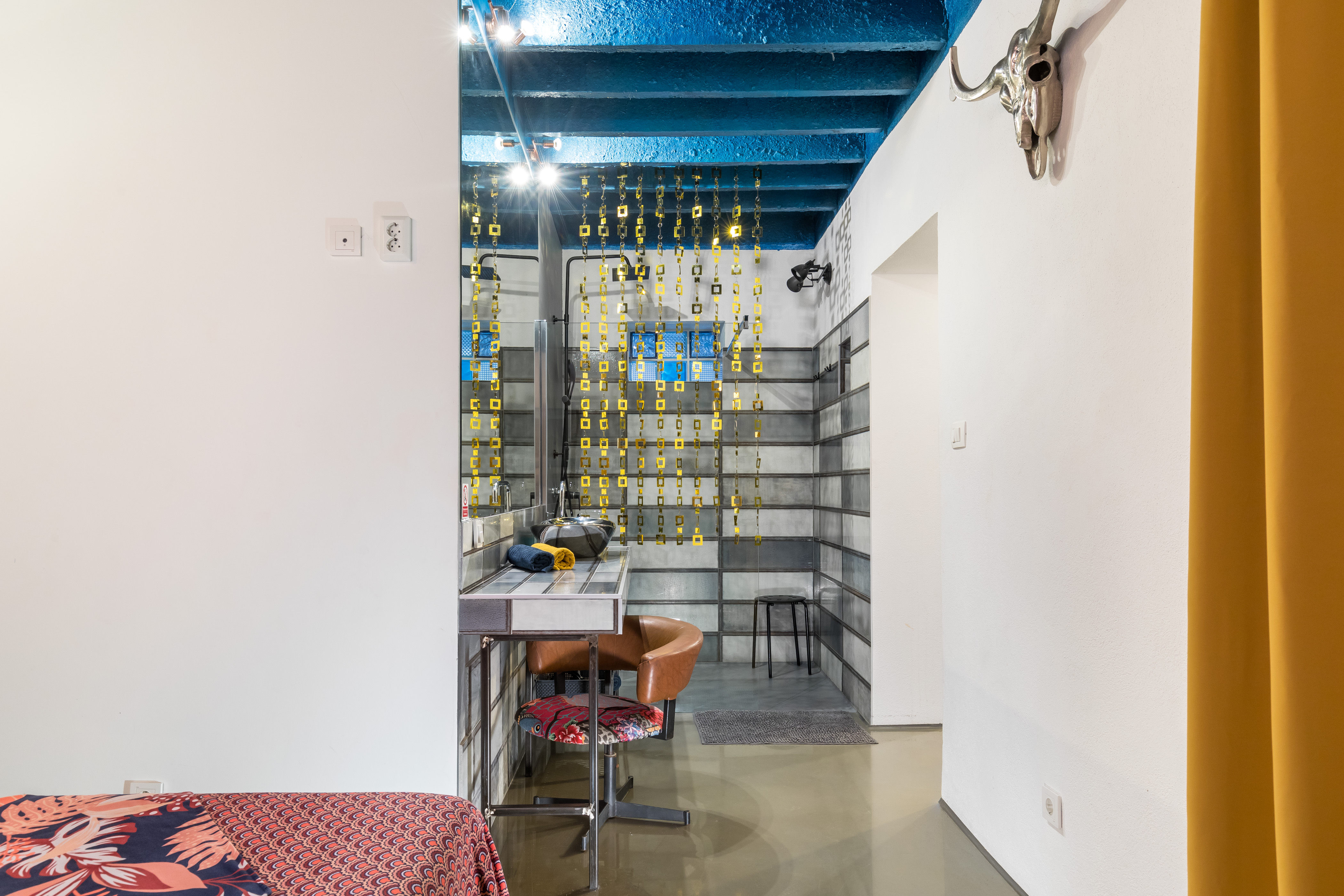 APARTMENT “M” or “Street Art” features an alluring blend of various shades of grey, copper, and dark turquoise, accented with industrial and vintage details, infused with Banksy’s posters on the walls. A comfortable queen-size bed and armchairs are paired with a retro wooden coffee table and commode. Glossy epoxy flooring and adjustable lighting that changes colours to suit your mood make this the most sensual apartment available. It includes a kitchenette and a separate toilet at the entrance, with an intimate “wet room” attached to the bedroom featuring a spacious shower cabin comfortable for two.