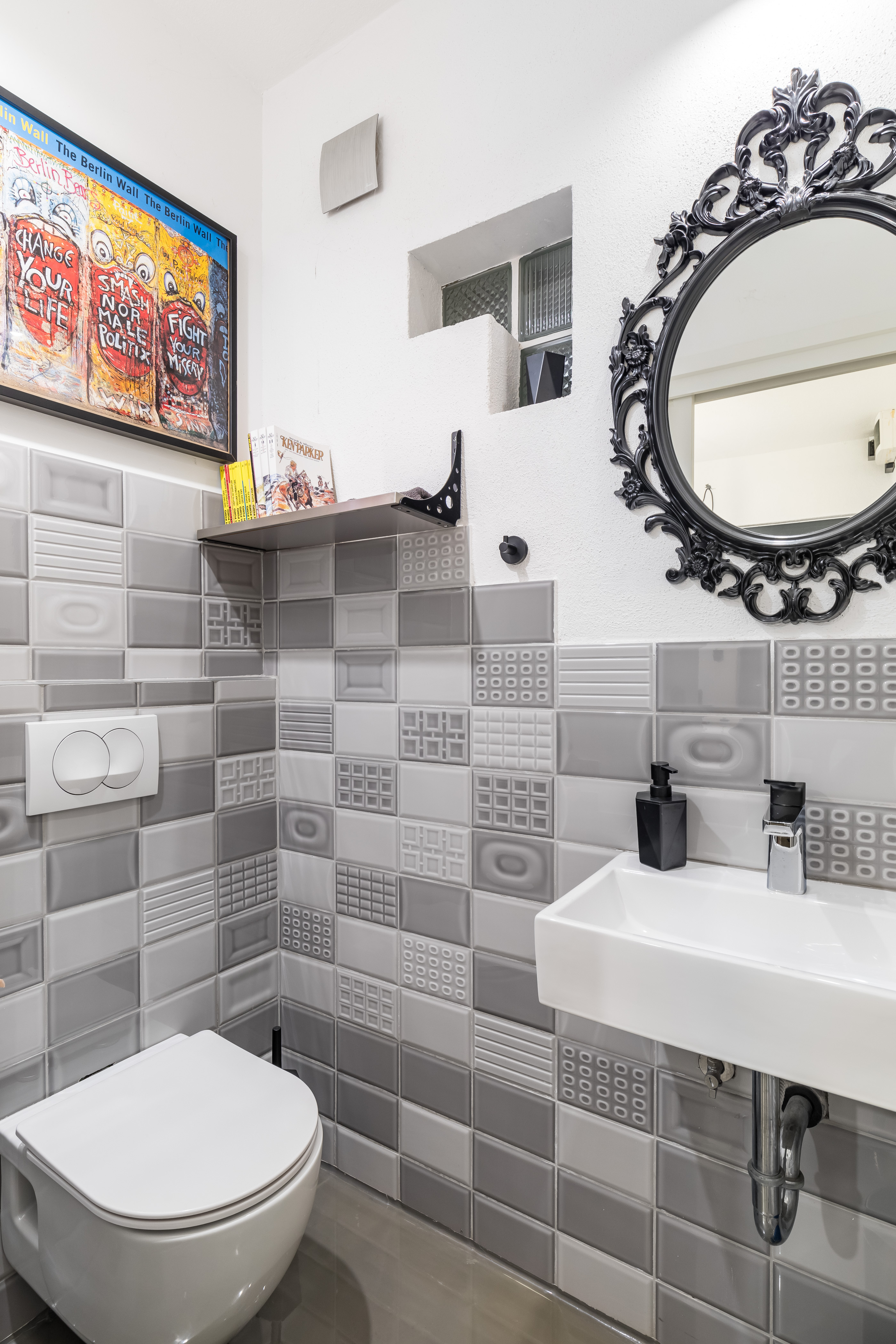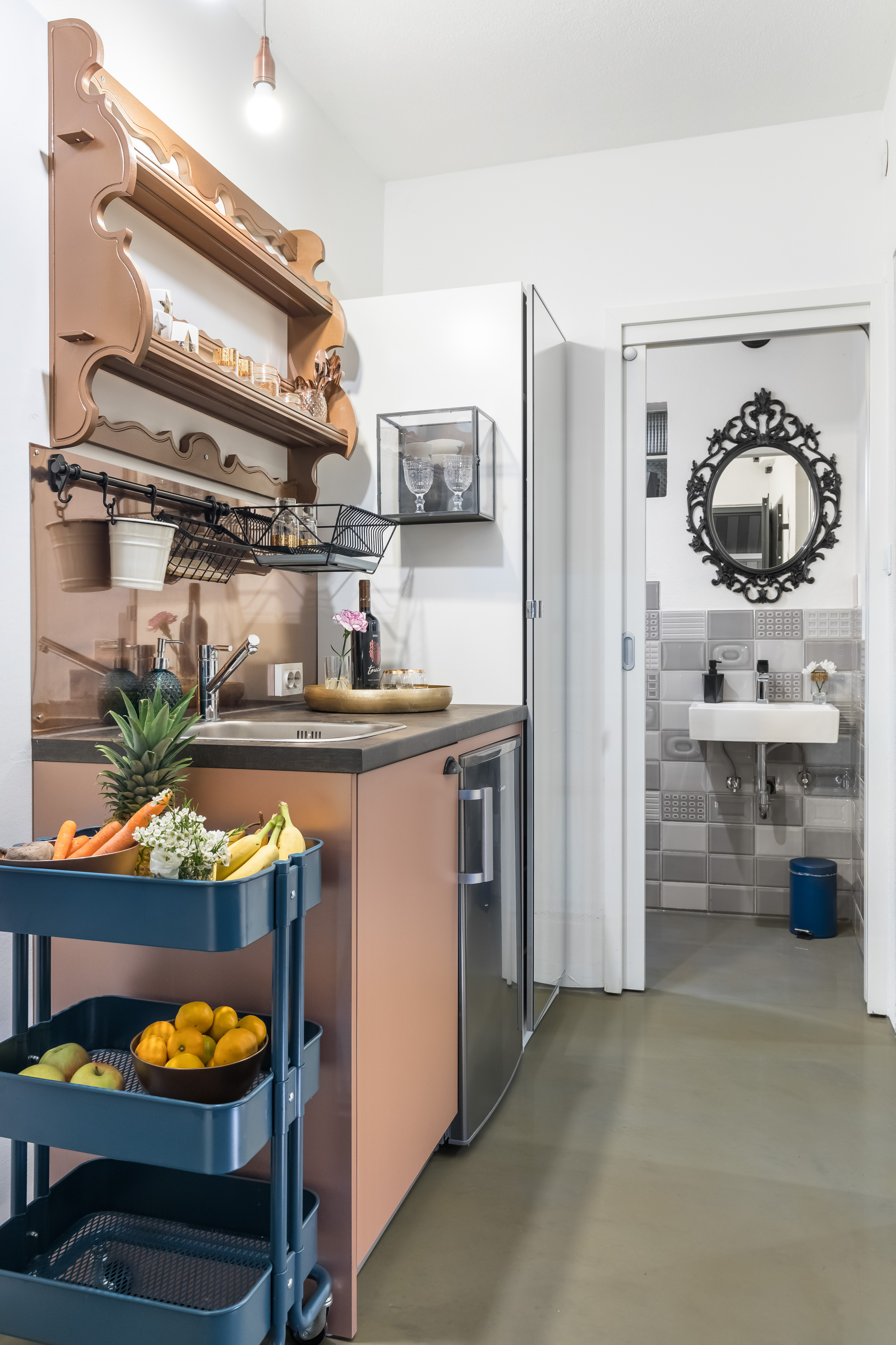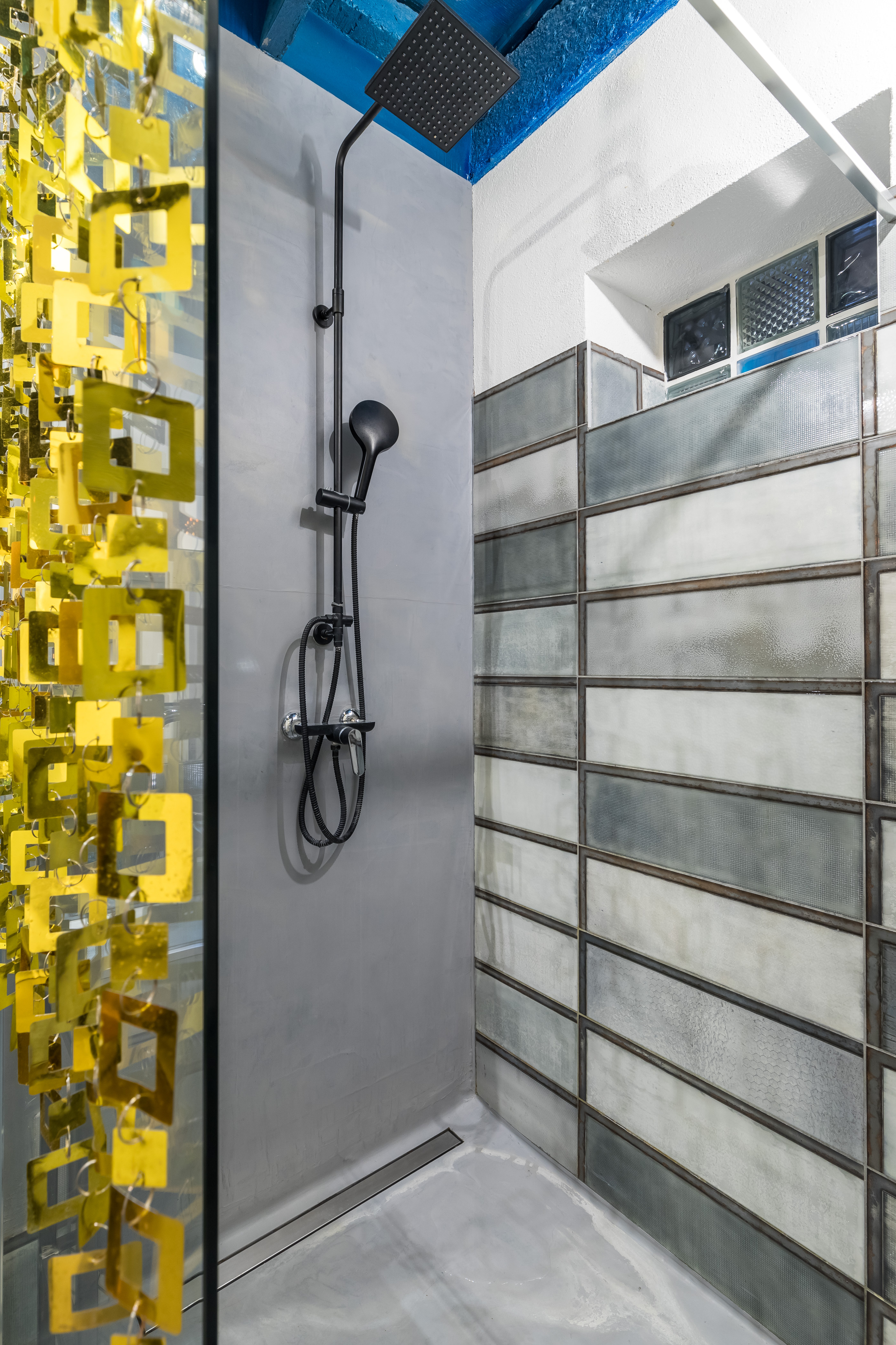 APARTMENT “M” or “Street Art” features an alluring blend of various shades of grey, copper, and dark turquoise, accented with industrial and vintage details, infused with Banksy’s posters on the walls. A comfortable queen-size bed and armchairs are paired with a retro wooden coffee table and commode. Glossy epoxy flooring and adjustable lighting that changes colours to suit your mood make this the most sensual apartment available. It includes a kitchenette and a separate toilet at the entrance, with an intimate “wet room” attached to the bedroom featuring a spacious shower cabin comfortable for two.