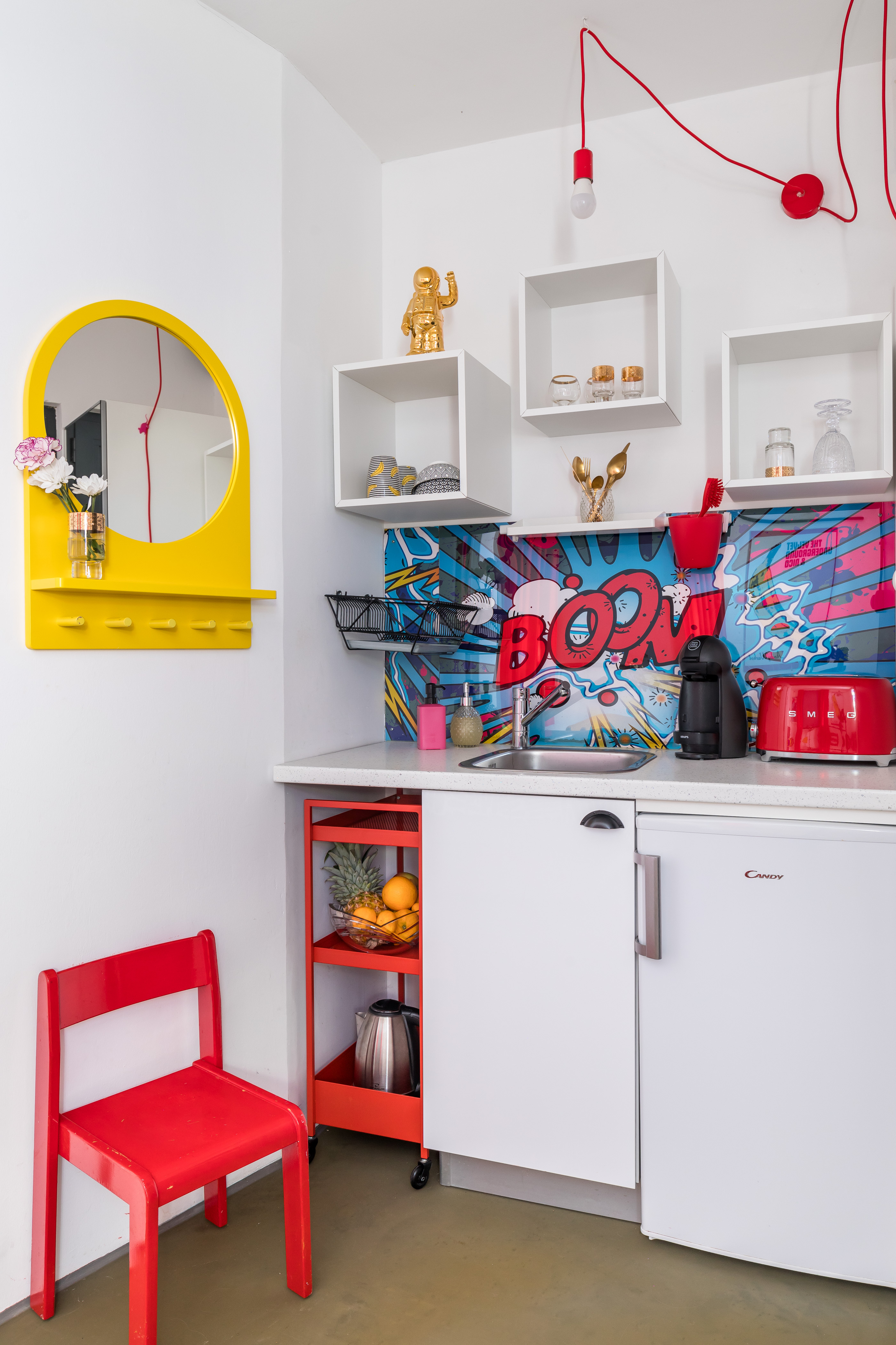 - kitchen or kitchenette with breakfast & coffee essentials like the fridge, water kettle, blender, toaster and the coffee